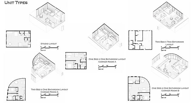 The units are arranged to interlock with one another like puzzle pieces, responding directly to the building’s organic floor plate. Each apartment type is strategically placed to maximize efficiency, light, and circulation while maintaining a cohesive overall form. Corner units anchor the geometry, allowing standard units to fit seamlessly between them and create a balanced, continuous layout across the floor.